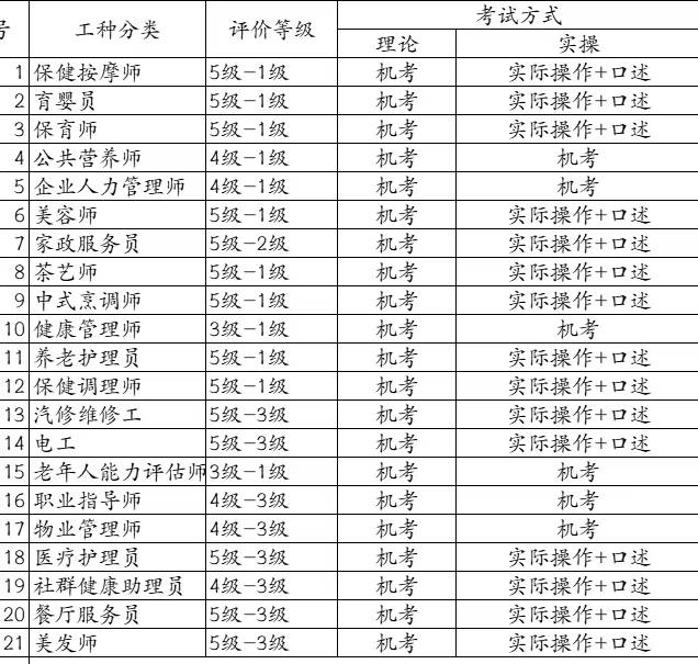 保健按摩师、育婴员、保育师、公共营养师、企业人力管理师、美容师、家政服务员、茶艺师、中式烹调师、健康管理师、养老护理员、保健调理师、汽修维修工、电工、老年人能力评估师、职业指导师、物业管理师、医疗护理员、社群健康助理员、餐厅服务员、美发师、铣工、车工